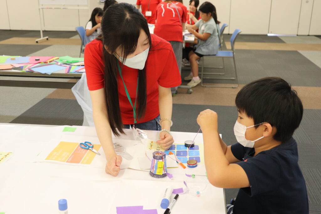 大学生の先生に優しく教えてもらいながら、材料や色を生き生きと選び、集中して制作!