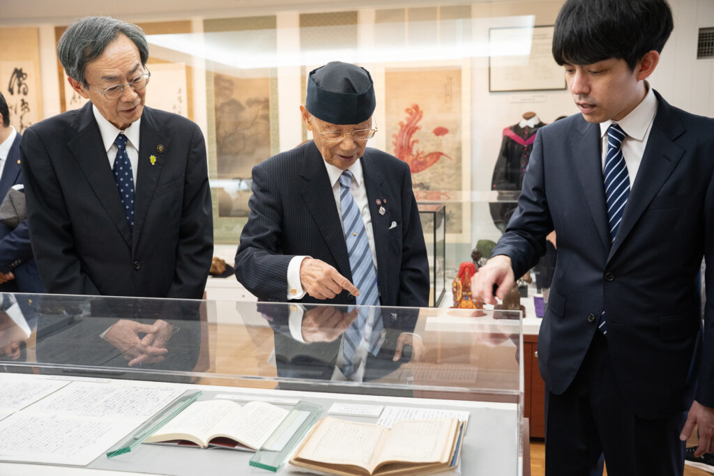 茶会終了後には、大村博士の案内のもと、千宗史若宗匠が螢雪寮や当館を視察され、楽しく会話を交わしながら展示作品や大村博士ゆかりの品々を鑑賞されました😊