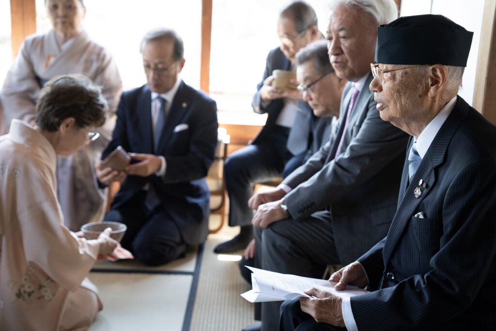 また、床の間の掛け軸は、先月逝去された裏千家第15代家元・千玄室大宗匠が揮毫し、この茶会のために贈られたもので、特別な意義をもつ一幅として紹介されました。
