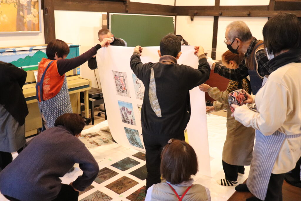 最後には、参加者全員の版木を並べ、大きな紙にみんなで一緒に作品を刷り上げる特別な体験も👏