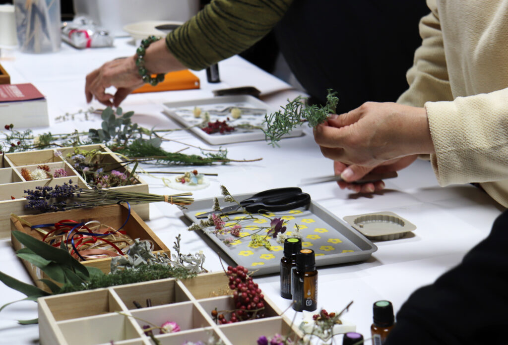 数々のドライフラワーやアロマオイルの中からお好みのものを選び、オリジナルのアロマワックスプレートを制作🌸