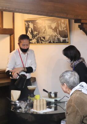 学芸員による企画展ギャラリートークの後、螢雪寮(ミーティングルームぜんぽう)でワークショップを行いました。講師は、珈琲と焼菓子のお店overQ 店主の喜連川太氏です。