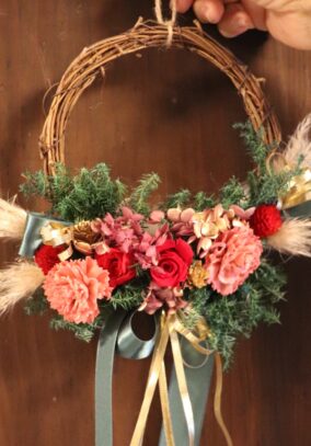 今回制作したリースは、バラやアジサイのプリザーブドフラワーなどが可愛らしく、長いリボンがエレガントな大人っぽいデザイン🌹材料は同じでも、作り手によって個性が出せるリースです。