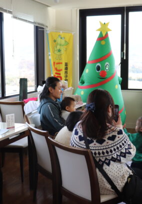 その後は展望室で、にら★ちびスタッフさんのクリスマスシアター👏最後はかわいいクリスマスツリーさんからプレゼントが渡されました🎄美術館からも職員の手作りリースのチャームやお菓子をプレゼント🎁